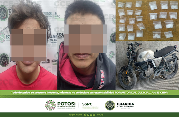 Continuando con los dispositivos de seguridad y vigilancia, en la Prolongación Privada del Arrollo en la colonia Fracción Rivera, elementos de la GCE detuvieron a dos masculinos, quienes se identificaron como Kevin de 19 años de edad y Adrián de 22 años, asegurándoles 25 dosis de “cristal” y una motocicleta marca Vento, modelo 2022, color gris, con placa de esta Entidad.