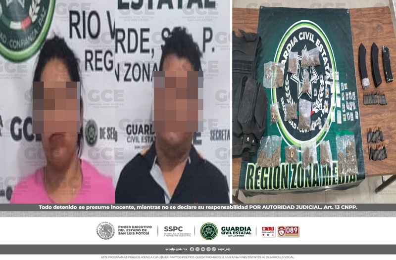 A Gabriela “N” de 29 años de edad y a José Luis “N” de 39 años, se les aseguraron 12 bolsas con marihuana; 17 dosis de “cristal”; 20 de cocaína, así como tres cargadores metálicos; 27 cartuchos útiles de calibre 7.62, además de 22 cartuchos calibre .223 y un chaleco táctico. Cabe señalar que la motocicleta en la que viajaban, contaba con reporte de robo.