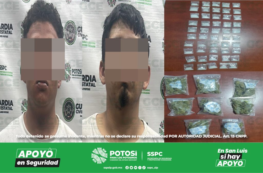 Los hechos tuvieron lugar en la colonia Casanova, agentes de la GCE detuvieron a Alfonso “N” de 24 años de edad y a Erick “N” de 26 años a quienes se les aseguraron ocho bolsas con marihuana y 50 dosis de “cristal”, derivado de los dispositivos emitidos en dicha zona.