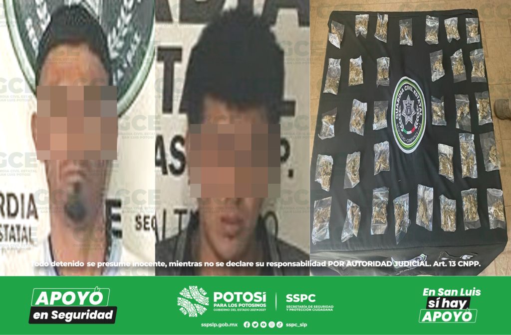 Charcas, S.L.P.- Oficiales de la Guardia Civil Estatal (GCE) detuvieron a dos presuntos narcomenudistas quienes presumiblemente son parte de una célula criminal generadora de violencia; al momento de su detención se le aseguraron varias dosis de marihuana.