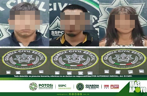 Tamuín, S.L.P.- Como parte de la aplicación del Plan Integral de Seguridad en todo el territorio potosino, elementos de la Guardia Civil Estatal, detuvieron a tres personas que presuntamente se dedican a la venta de droga para un grupo criminal.