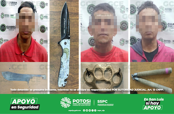 S.L.P.- Tanto en la ciudad capital como en el municipio de Soledad de Graciano Sánchez, policías de la Guardia Civil Estatal (GCE) detuvieron a cuatro hombres luego de ser sorprendidos con armas punzocortantes y/o prohibidas que llevaban consigo.