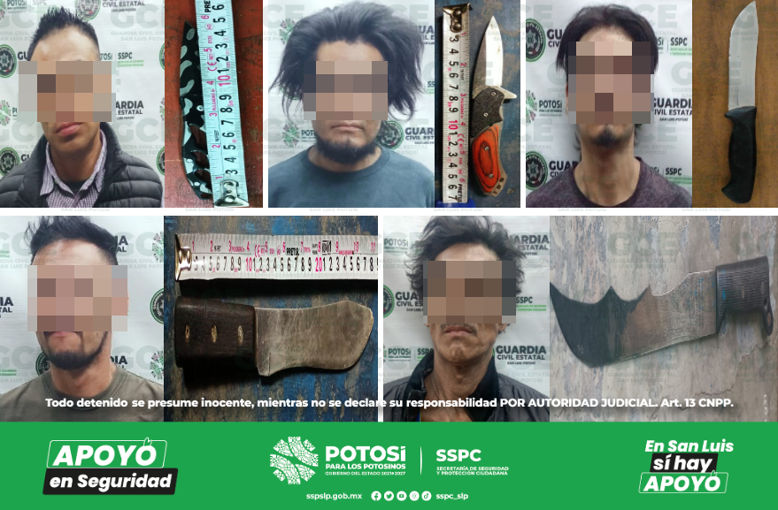 San Luis Potosí, S.L.P.- Derivado de los operativos de seguridad y vigilancia llevados a cabo por policías de la Guardia Civil Estatal (GCE) cinco masculinos resultaron detenidas después de que fueran sorprendidos con armas punzocortantes.