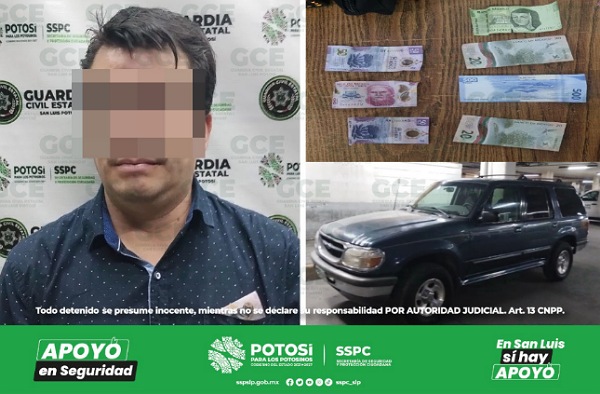 San Luis Potosí, S.L.P.- Un automovilista fue detectado por la Guardia Civil Estatal (GCE) a velocidad inmoderada, quedó detenido por probables delitos contra la seguridad vial y posible cohecho, al ofrecer dinero en efectivo a cambio de no ser detenido.