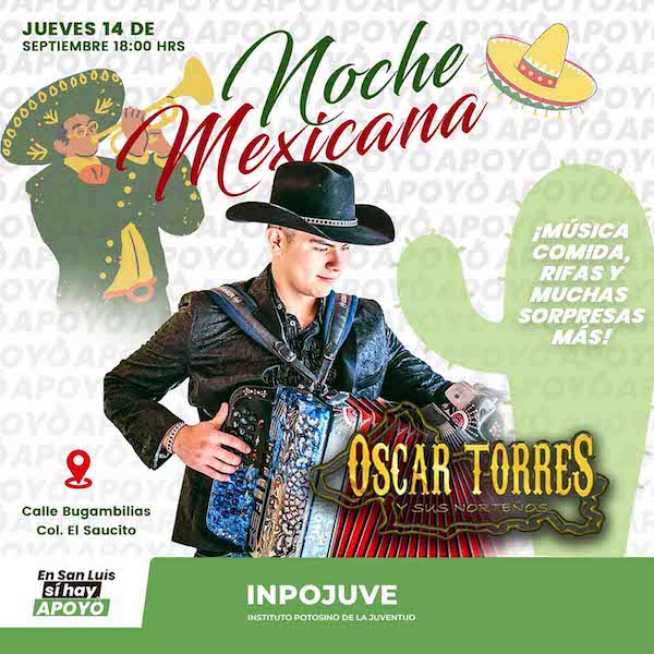El Gobierno del Estado, a través del Instituto Potosino de la Juventud (Inpojuve), invita a la «Gran Noche Mexicana», que se llevará a cabo este jueves 14 de septiembre a las 18:00 horas, en la calle Bugambilias de la colonia Saucito, donde habrá baile y comida mexicana que se fusionarán en una noche llena de emoción, con sorpresas y dinámicas, además de contar con la música en vivo de Oscar Torres y sus norteños.