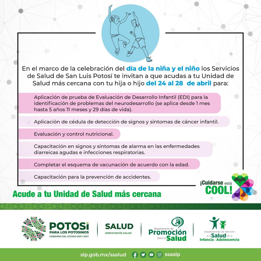 El Secretario de Salud, Dr. Daniel Acosta Díaz de León informó que del 24 al 28 de abril, en el marco de la celebración del Día del Niño y de la Niña se estarán realizando en los centros de Salud del Gobierno del Estado la Jornada de Salud en atención a las y los menores con servicios de vacunación, capacitación en prevención de accidentes, prueba de Evaluación de Desarrollo Infantil, capacitación para detectar signos y síntomas de cáncer infantil, infecciones diarreicas y respiratorias.