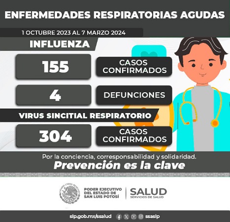 Del 1° al 7 de marzo se registraron 7 casos de influenza, sumando del 1º de octubre de 2023 inicio de la temporada invernal al 7 de marzo del 2024 155 casos y cuatro defunciones de influenza en el Estado; esta semana no se presentaron nuevos casos de virus sincitial respiratorio, teniendo acumulados 304 casos en lo que va de la temporada invernal.