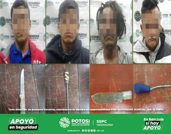 San Luis Potosí.- Acciones contundentes en materia preventiva y de seguridad por parte de la Guardia Civil Estatal, dieron como resultado la detención de cuatro personas por la portación de armas prohibidas.
