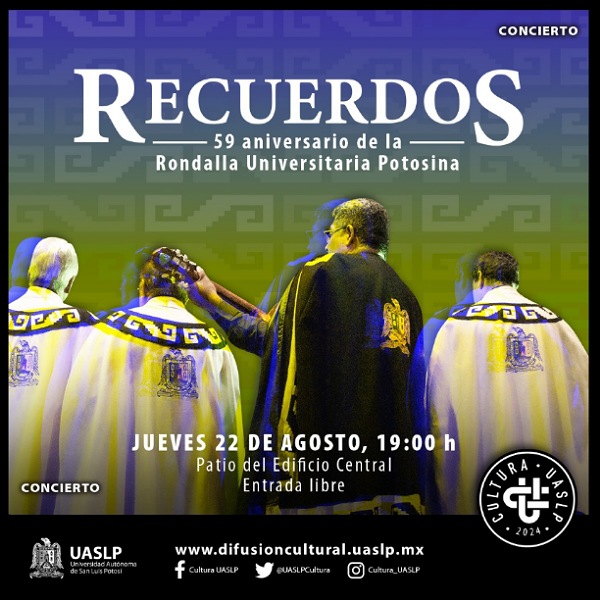 En una noche llena de música y remembranza, la Rondalla Universitaria Potosina ofrecerá el concierto “Recuerdos”, como parte de la celebración de su 59 aniversario. La cita es el próximo jueves 22 de agosto a las 19:00 horas en el patio del Edificio Central de la Universidad Autónoma de San Luis Potosí (UASLP), con entrada libre para todo público.