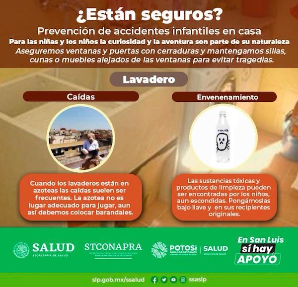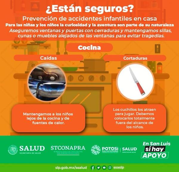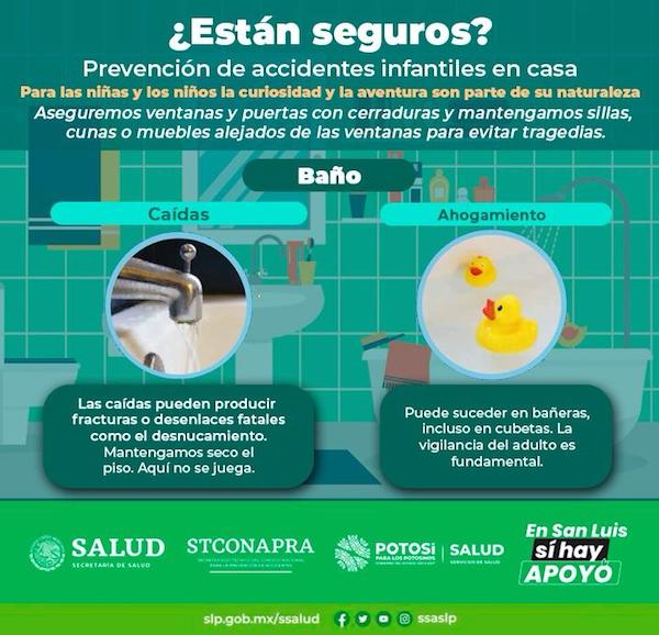 Para la prevención de caídas, recomienda: no dejar solos a niñas y niños sobre camas, sillas u otras superficies elevadas; e instalar barandales o protectores en escaleras, terrazas, balcones y ventanas: Para la prevención de ahogamientos y asfixias, se aconseja, mantener fuera de su alcance objetos pequeños, bolsas de plástico, cordones o artículos que puedan causar estrangulamiento o asfixia. Cubrir recipientes con agua como cubetas, piletas, cisternas o lavaderos; supervisar constantemente a niñas y niños cuando se encuentren cerca o dentro de albercas, incluso si saben nadar. Y para menores de 1 año, evitar el exceso de cobijas, almohadas o peluches en su cuna.