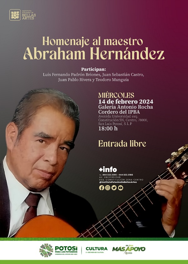 En San Luis Potosí hay más apoyo en cultura, por lo que la Secretaría de Cultura de Gobierno del Estado, invita al público en general a participar en el homenaje que se le realizará al guitarrista Abraham Hernández Ortíz, en la Galería Antonio Rocha Cordero del Instituto Potosino de Bellas Artes, el miércoles 14 de febrero a las 18:00 h, entrada libre.