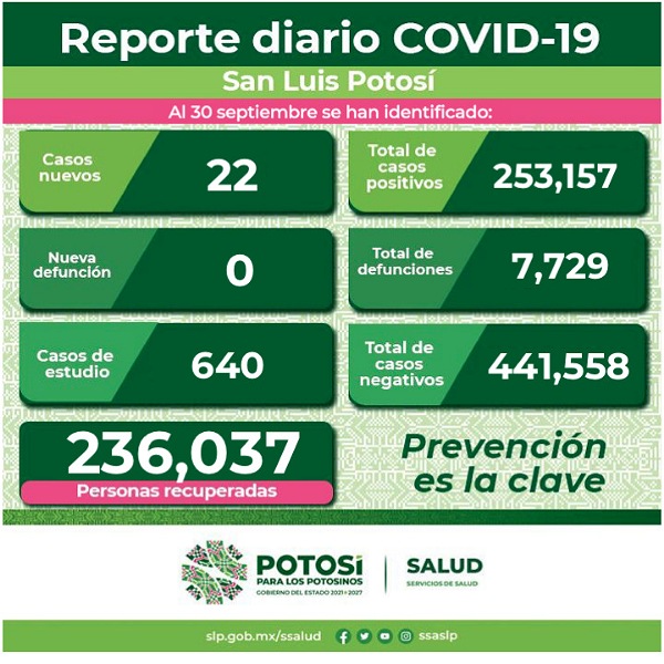 Se dan a conocer 22 nuevos contagios confirmados en la Entidad. De esta forma, el Comité Estatal para la Seguridad en Salud y los Servicios de Salud informan que se registran 253 mil 157 casos totales de este padecimiento.