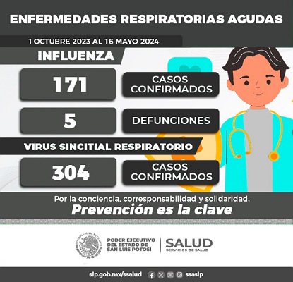 Del 10 al 16 de mayo se registraron 2 nuevos casos de influenza y una nueva defunción, sumando de octubre 2023 inicio de la temporada invernal a mayo 16 del 2024, 171 casos y 5 defunciones debido a esta enfermedad respiratoria; de virus sincitial respiratorio no se presentaron casos nuevos.