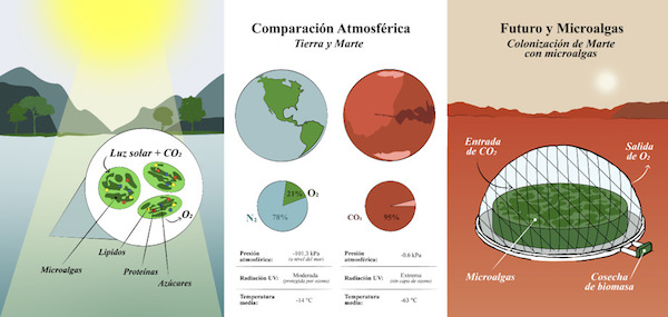Las microalgas son organismos microscópicos que miden entre 2 y 50 µm; por ejemplo, una de 10 µm es varias veces más pequeña que el grosor de un cabello humano, y en un milímetro caben decenas o cientos de ellas. Son capaces de realizar fotosíntesis: aprovechan la luz para transformar CO2 en oxígeno y biomasa rica en compuestos valiosos. Está biomasa contiene proteínas, azúcares y lípidos, y hoy en día se utiliza tanto en alimentación humana como en la industria alimentaria y farmaceútica. En Marte, donde el CO2 es abundante, podría aprovecharse a través de las microalgas para generar recursos esenciales y sustentar la vida. Su potencial va más allá de producir oxígeno. Crecen rápido, requieren pocos nutrientes y algunas especies toleran condiciones extremas, como altas concentraciones de CO2, baja presión, temperaturas variables, alta radiación y limitación de agua. Integradas en sistemas cerrados y controlados, podrían capturar CO2, producir oxígeno y generar biomasa útil como alimento o materia prima. En esencia, permitirían crear pequeños ecosistemas artificiales capaces de sostener la vida humana.