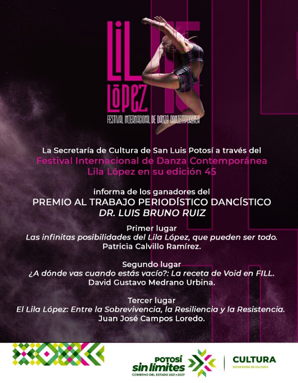El Gobierno del Estado de San Luis Potosí, a través de la Secretaría de Cultura de Gobierno del Estado, felicita y da a conocer a las y los ganadores de los concursos Premio al trabajo periodístico dancístico Dr. Luis Bruno Ruiz y Concurso Nacional de Fotografía Walter Reuter, realizados en el marco de la 45ª edición del Festival Internacional de Danza Contemporánea Lila López, llevado a cabo del 13 al 20 de octubre de 2025.