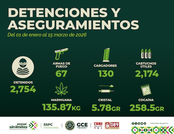 Como resultado de los operativos desplegados en las cuatro regiones y de las labores de inteligencia que reflejan el cambio que se vive en San Luis Potosí, la Secretaría de Seguridad y Protección Ciudadana del Estado (SSPC), a través de la Guardia Civil Estatal (GCE), detuvo a dos mil 754 personas vinculadas a diversos delitos, quienes fueron puestas a disposición de las autoridades correspondientes, del 1 de enero al 15 de marzo de 2026.