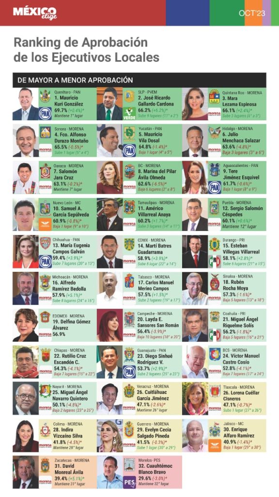 México Elige, en su estudio de octubre de 2023, ubicó al Gobernador del Estado en segundo lugar con mayor aprobación ciudadana, al lograr 66.2 por ciento, solo por debajo de Querétaro