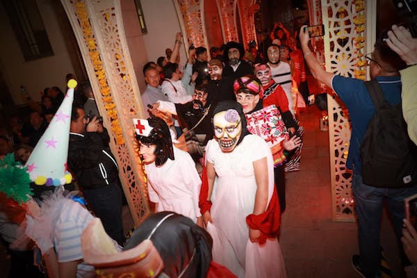 El Palacio de Gobierno se llenó de luz, color y fragancias, con la participación de comparsas tradicionales de la Huasteca y el altar que muestra siete niveles del viaje del alma, representando la travesía espiritual, incluyendo elementos como el agua, la sal, las velas y veladoras, el copal e incienso, las flores de cempasúchil y las calaveras, frutas, pan de muerto, papel picado y fotografías.