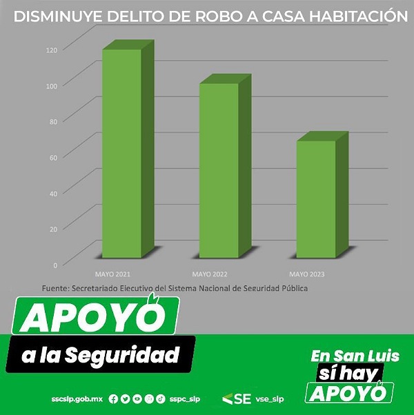 Respecto a los últimos datos proporcionados por el Secretariado Ejecutivo del Sistema Nacional de Seguridad Pública, se registra una importante disminución del 33% en el delito de robo a casa habitación durante el mes de mayo de 2023 en la entidad potosina, esto en comparación con el mismo periodo del año anterior. Miguel Gallegos Cepeda, Vocero de Seguridad del Gobierno del Estado, informó que esta reducción refleja los avances en los trabajos de sensibilización, concientización y prevención realizados por el Gobierno del apoyo.