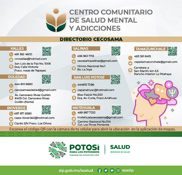En CECOSAMA se maneja un modelo asistencial más completo con el objetivo de contribuir a mejorar la cobertura para la población usuaria y que formen parte de una Red integrada de Servicios de Salud. En San Luis Potosí existen 7 Centros distribuidos en los siguientes municipios: San Luis Potosí, Soledad de Graciano Sánchez, Matehuala, Salinas, Rioverde, Ciudad Valles y Tamazunchale. Para saber cuál es la unidad más cercana a ti, puedes llamar a la Línea de la Vida al 800-911-2000, ahí te darán información, direcciones y horarios de los centros, asimismo, puedes acudir directamente a cualquier centro a solicitar cita y atención.