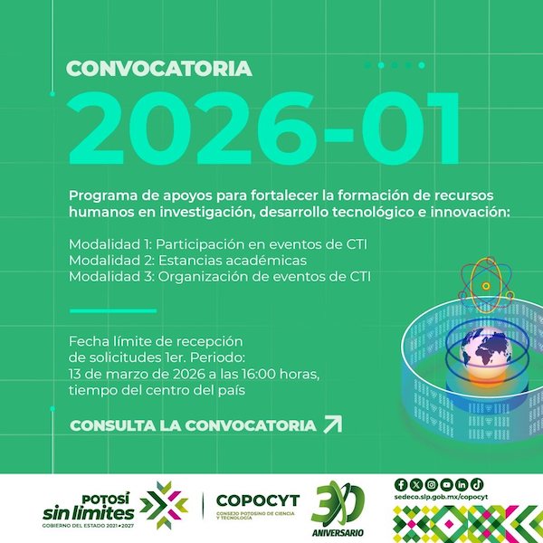 Con el objetivo de consolidar el talento científico y tecnológico en el Estado, el Consejo Potosino de Ciencia y Tecnología (Copocyt), con recursos del Fideicomiso 23871, publicó la Convocatoria 2026-01 del «Programa de apoyos para fortalecer la formación de recursos humanos en investigación, desarrollo tecnológico e innovación». Esta estrategia se alinea con la ruta de desarrollo sin límites impulsada por el Gobernador Ricardo Gallardo Cardona, que apuesta por ampliar las oportunidades de formación y fomentar vocaciones científicas, en áreas clave para el crecimiento.