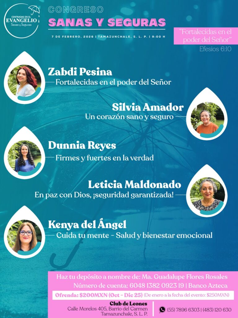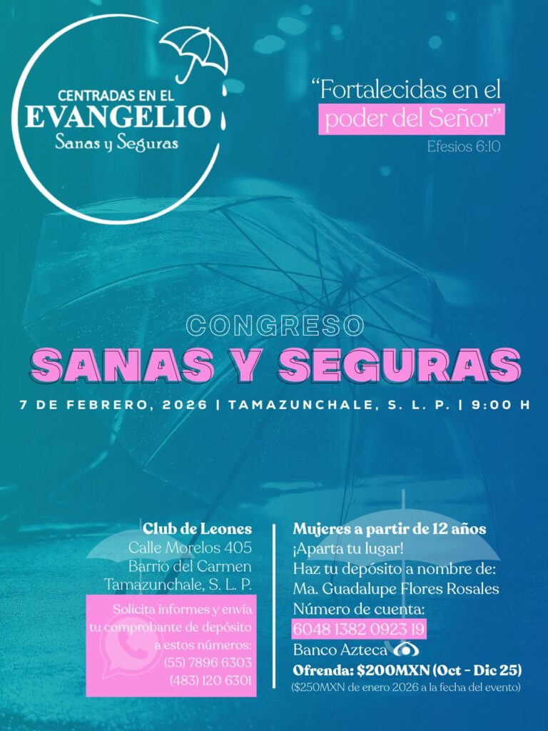 Una mañana para renovarse, fortalecerse y reconectar con la fe está por llegar a Tamazunchale. El próximo 7 de febrero de 2026, mujeres a partir de los 12 años están invitadas a vivir el Congreso “Sanas y Seguras”, un encuentro diseñado para inspirar seguridad, sanidad interior y bienestar emocional, guiado por el poder de la palabra de Dios.