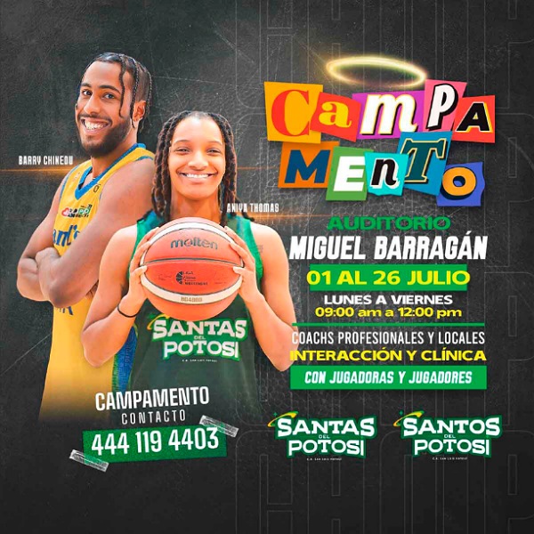 Derivado del impulso a todas las disciplinas deportivas y al rescate del baloncesto profesional en San Luis Potosí por parte del Gobierno del Estado, el equipo “Santos del Potosí”, realizará del primero al 26 de julio de 2024, un campamento de verano infantil en las modalidades semanal, parcial o total, dirigido a niñas, niños y jóvenes de entre seis y 16 años, que podrán convivir con las y los jugadores profesionales de los equipos femenil y varonil.