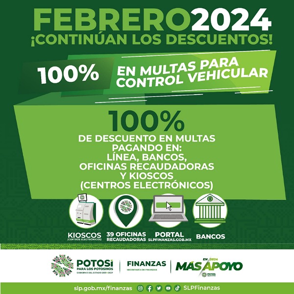 Como parte de los programas que durante este 2024 brindan más apoyo a las familias potosinas, la Secretaría de Finanzas (Sefin) amplió el plazo del programa de descuentos del 100 por ciento en multas de control vehicular, durante el mes de febrero, al realizar sus pagos en línea, bancos, kioscos y oficinas recaudadoras.