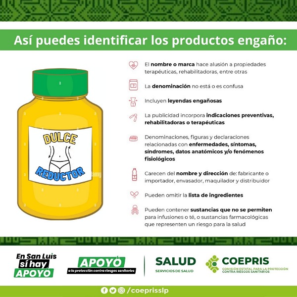 En apoyo a la salud de la población y para evitar riesgos sanitarios, la Comisión Estatal para la Protección Contra Riesgos Sanitarios (COEPRIS) realiza de manera permanente la vigilancia y control sanitario de aquellos productos catalogados como auxiliares al manejo de alguna enfermedad, reductores de peso, suplementos alimenticios o bien de uso cosmético a fin de detectar la venta de “productos engaño”.