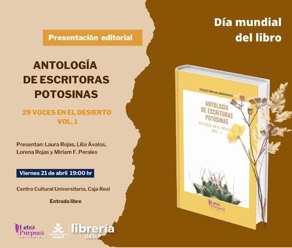 Letra Púrpura Editorial invita a la presentación de la Antología de Escritoras Potosinas, 29 Voces en el desierto Vol. 1, se llevará a cabo dentro de la celebración del Día Mundial del Libro, el viernes 21 de abril, a las 19:00 horas, en el Centro Cultural Universitario, Caja Real, de la UASLP. Los comentarios están a cargo de las escritoras Laura Rojas, Lilia Ávalos, Lorena Rojas y Miriam F. Perales. Entrada libre.