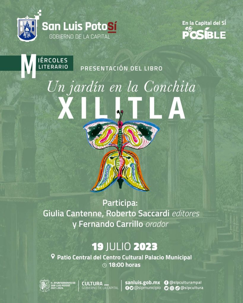 El Gobierno de la Capital y la Dirección de Cultura invitan a la presentación del libro: “Un jardín en la Conchita, XILITLA”, el universo de Edward James, el cual se llevará a cabo en el marco del Miércoles Literario en Palacio Municipal este próximo miércoles 19 de julio a partir de las seis de la tarde.