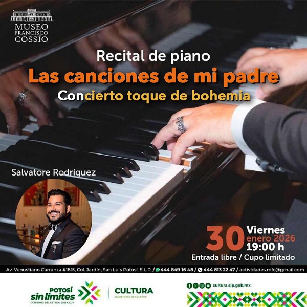 La Secretaría de Cultura de Gobierno del Estado invita al público en general al recital de piano “Las canciones de mi padre” Concierto toque de bohemia, a cargo de Salvatore Rodríguez, que se llevará a cabo el viernes 30 de enero a las 19:00 h, en el Museo Francisco Cossío, entrada libre con cupo limitado.