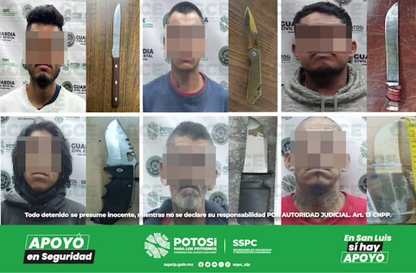 S.L.P.- Operativos de seguridad en la capital y en la zona conurbada, resultaron en la detención de seis hombres, después de que agentes de la Guardia Civil Estatal (GCE) los detuvieran en probable portación de armas prohibidas.