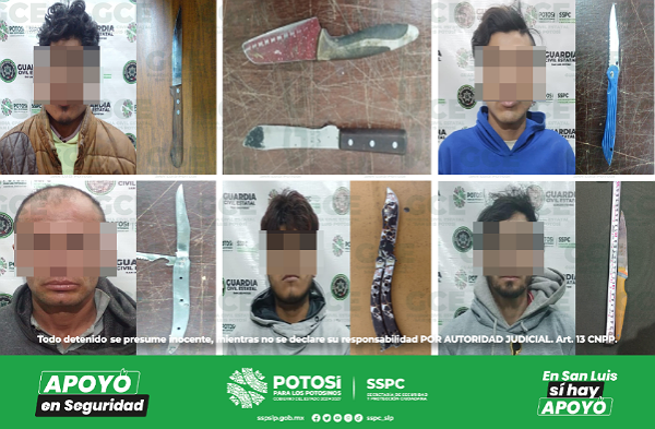 S.L.P.- En diferentes puntos de la capital potosina y en el municipio de Soledad de Graciano Sánchez, elementos de la Guardia Civil Estatal (GCE), detuvieron a cinco hombres y un joven de 17 años de edad, por el probable delito de portación de armas prohibidas.