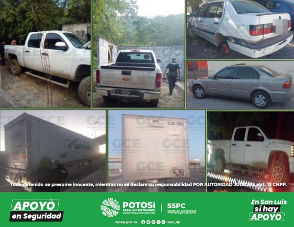 A su vez, en el municipio de Tanlajás, en el Barrio El Zapote Coromohom, elementos de la GCE localizaron de manera inmediata una camioneta marca Chevrolet, tipo Silverado, con placas del Estado, la cual fue hurtada con violencia de la carretera estatal Chacana a San Antonio, en el municipio de Tancanhuitz.