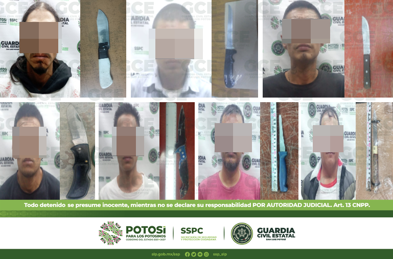 San Luis Potosí, S.L.P.- Elementos de la Guardia Civil Estatal detuvieron a siete hombres acusados de portar consigo armas prohibidas, por lo que fueron puestos a disposición de la Fiscalía General del Estado.