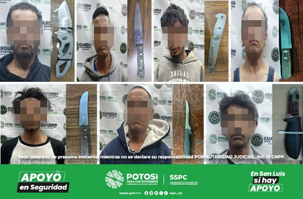 San Luis Potosí, S.L.P.- En diferentes acciones operativas, encaminadas a preservar la paz pública en la capital potosina, elementos de Guardia Civil Estatal (GCE) detuvieron a siete presuntos después de que fueran sorprendidos con armas punzocortantes en su poder.