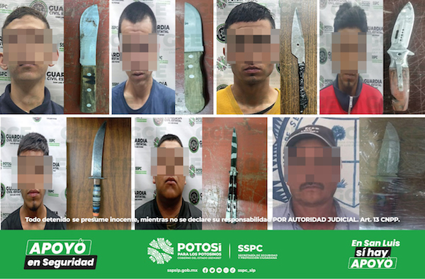 S.L.P.- Distintos operativos de seguridad, efectuados por policías de la Guardia Civil Estatal (GCE) permitieron la detención de siete presuntos tanto en la zona metropolitana como en el interior del estado luego de que se les sorprendiera con armas punzocortantes.