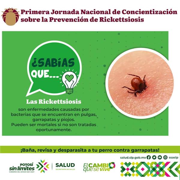 El Gobierno de San Luis Potosí, a través del departamento de Zoonosis de los Servicios de Salud se une a la Jornada de difusión y atención a la Rickettsiosis, enfocándose a la prevención de la enfermedad, que puede llegar a ser mortal si no se trata a tiempo, y que durante la temporada de calor suele incrementarse en mascotas porque aumenta la presencia de pulgas y garrapatas.