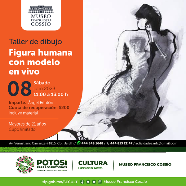 El sábado 08 de julio, se llevará a cabo el Taller de dibujo «Figura humana con modelo en vivo», que será impartido por Ángel Rentón de 11:00 a 13:00 horas. El taller está dirigido a personas mayores de 21 años y tiene una cuota de recuperación de $200, que incluye todos los materiales necesarios.