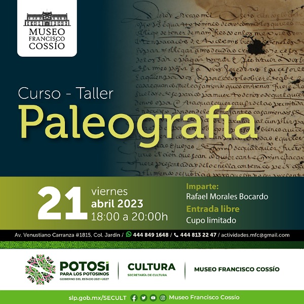 En el marco de las actividades que se estarán realizando para celebrar el Día Internacional del Libro, la Secretaría de Cultura de San Luis Potosí, les invita a participar en el taller de Paleografía, impartido por Rafael Morales Bocardo en el Museo Francisco Cossío que se llevará a cabo este viernes 21 de abril, en punto de las 19:00 horas, la entrada es libre y el cupo es limitado, por lo que las personas interesadas podrán registrarse a través de las redes sociales de este museo.