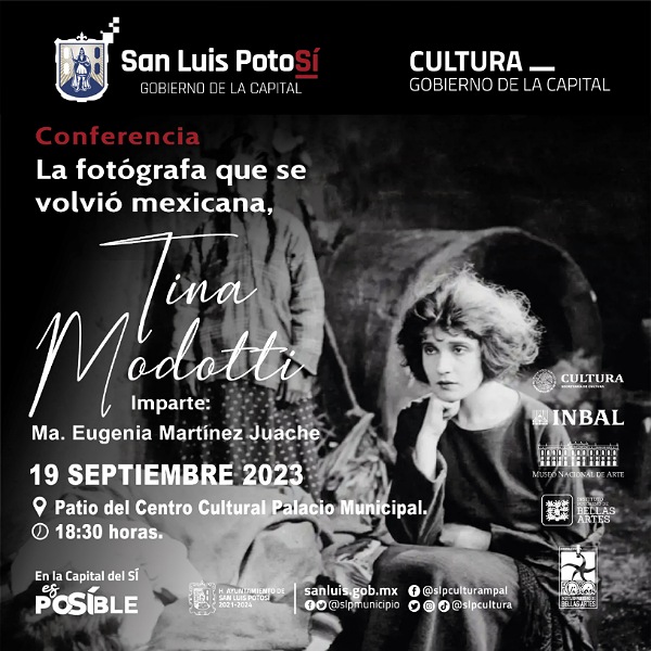 El Gobierno de la Capital de San Luis Potosí, a través de La Dirección de Cultura Municipal presenta la conferencia “La fotógrafa que se volvió Mexicana: Tina Modotti” que se realiza este martes 19 de septiembre a las 18:30 horas en el Patio del centro Cultural Palacio Municipal de San Luis Potosí, a cargo de María Eugenia Martínez Juache.