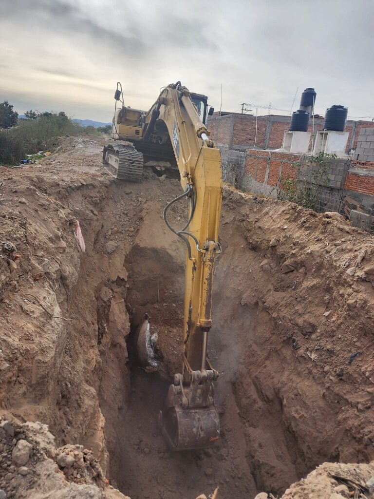 En esta vía de terracería la maquinaria está realizando excavaciones a una profundidad de hasta seis metros, para estar en condiciones de introducir un ducto con material de alta durabilidad que garantice su vida útil.