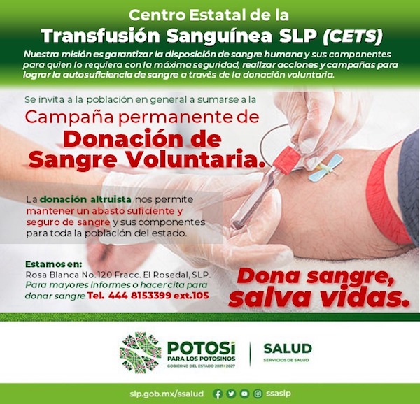 Por lo que el CETS interviene y apoya realizando campañas de donaciones altruistas en beneficio de las y los menores, invitando y solicitando a toda la población a que se conviertan en donadores de sangre, así como estar gestionando campañas con universidades, en la zona industrial, con hospitales, el Hospital General de Matehuala, Soledad, Rioverde, el Hospital del Niño y la Mujer, las oficinas de los Servicios de Salud, etc.
