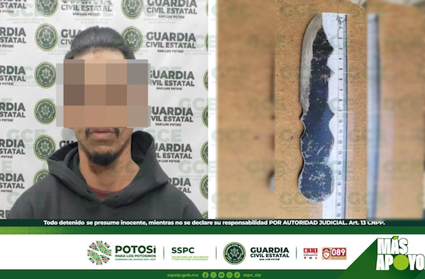 San Luis Potosí, S.L.P.- Patrullajes preventivos, efectuados por la Guardia Civil Estatal (GCE) derivaron en la detención de un masculino, por la presunta portación de un cuchillo, con el que deambulaba.