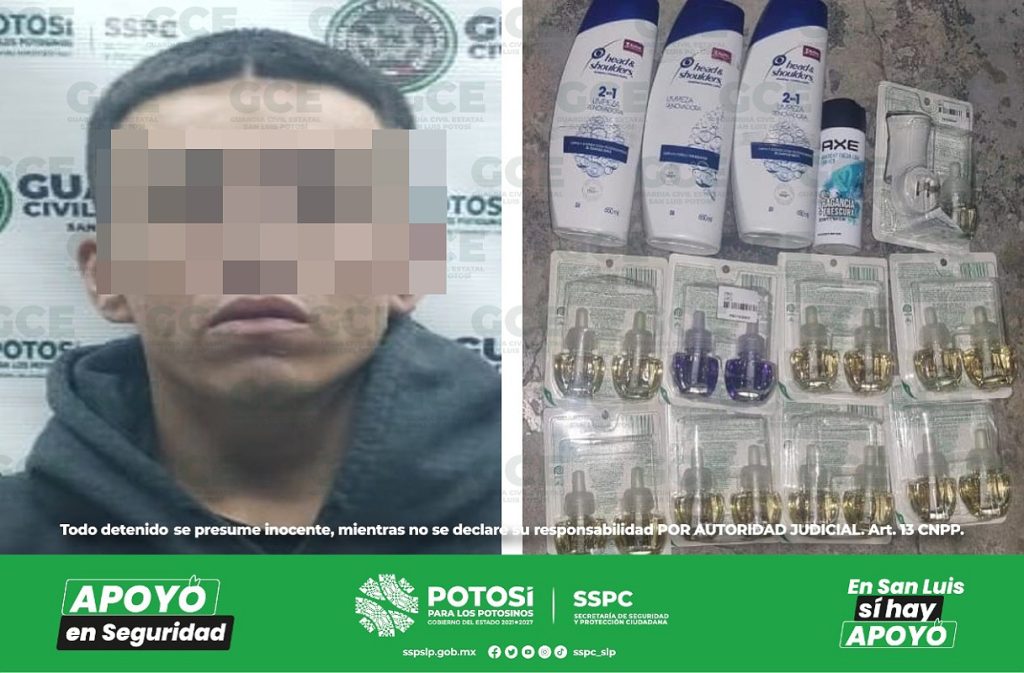 San Luis Potosí, S.L.P.- Una alerta sobre el presunto robo a un supermercado, fue atendido por elementos de la Guardia Civil Estatal; en el lugar de los hechos se capturó al probable responsable del hurto de varios aromatizantes y botellas de champú.