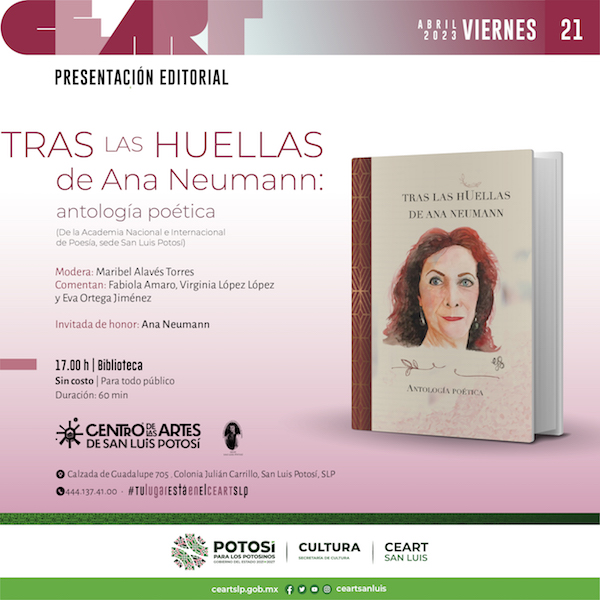 La Secretaría de Cultura de San Luis Potosí, en coordinación con la Academia Nacional e Internacional de Poesía, sede San Luis Potosí (ANIP SLP), invita a la presentación editorial de “Tras las huellas de Ana Neumann: antología poética”, que se llevará a cabo el viernes 21 de abril, a partir de las 17:00 horas en el Centro de las Artes SLP, contando con la presencia de la escritora potosina Ana Neumann como invitada de honor.