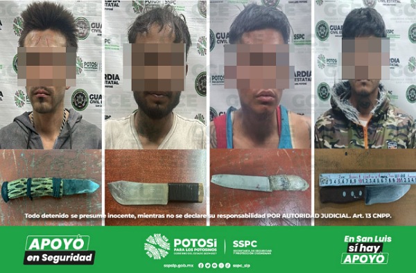 S.L.P.- Mediante los operativos de seguridad que son efectuados por la Guardia Civil Estatal (GCE), a fin de inhibir hechos antisociales o constitutivos del delito, cuatro hombres resultaron detenidos luego de que fueran sorprendidos en probable portación de armas prohibidas.