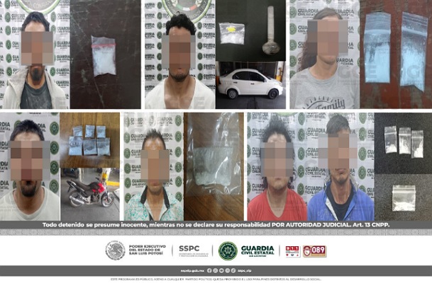 En la colonia Arboledas de Jacarandas, Ossiel “N” de 33 años de edad, fue detenido con una dosis de “cristal”; mientras que Jorge “N” de 27 años, quedó detenido en el fraccionamiento Villa Antigua, con una dosis de “cristal” y un vehículo en el que se desplazaba; por su parte, en la colonia General I. Martínez, Diego “N” de 22 años, fue asegurado con una dosis de marihuana; a su vez, en la colonia Tangamanga, Jorge “N” de 25 años, quedó detenido con seis dosis de “cristal” y una motocicleta.