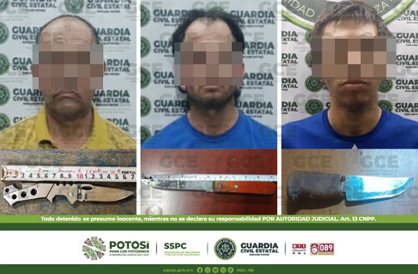 S.L.P.- En diferentes hechos, policías de la Guardia Civil Estatal (GCE) detuvieron a tres masculinos, por el presunto delito de portación de armas blancas.